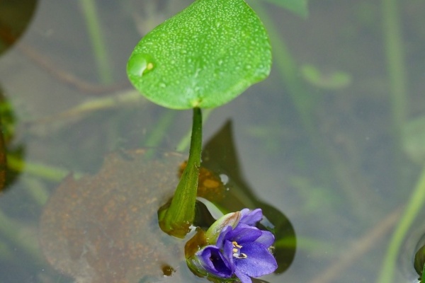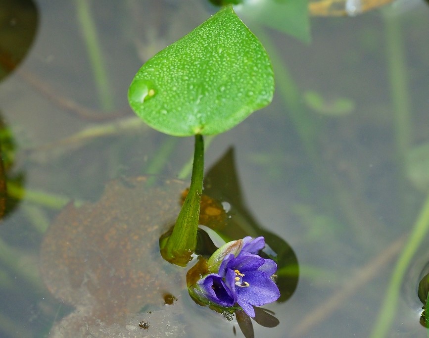 ビオトープの池に増えてきたコナギ 紫色の花を咲かせるのですね
