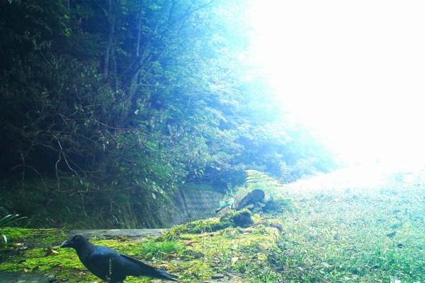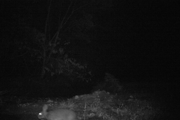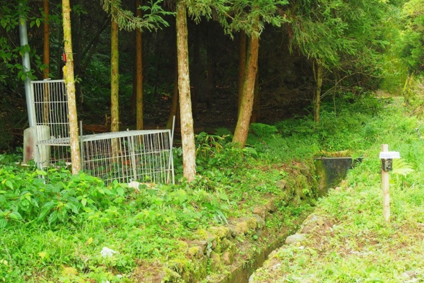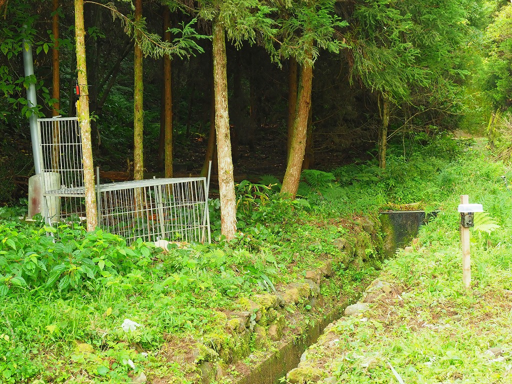 イノシシは以前からいましたが、今年になってアライグマの足跡が見つかりました。地元の猟友会の方の協力で罠を仕掛けました。画像右端にあるのは自動撮影装置。赤外線(体温)に反応して撮影します。